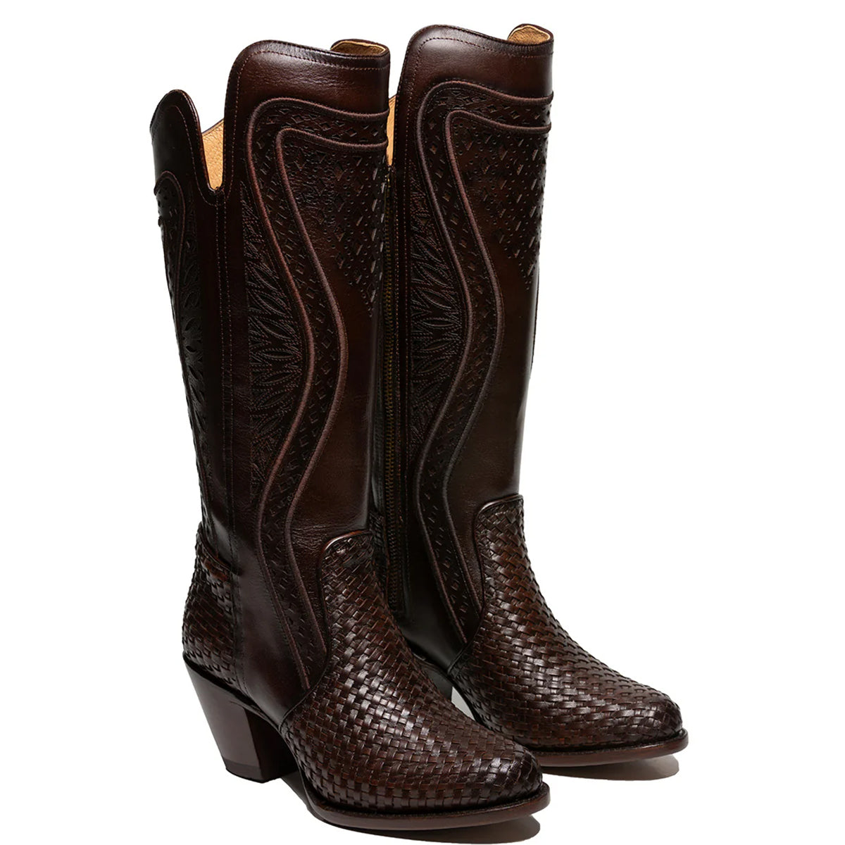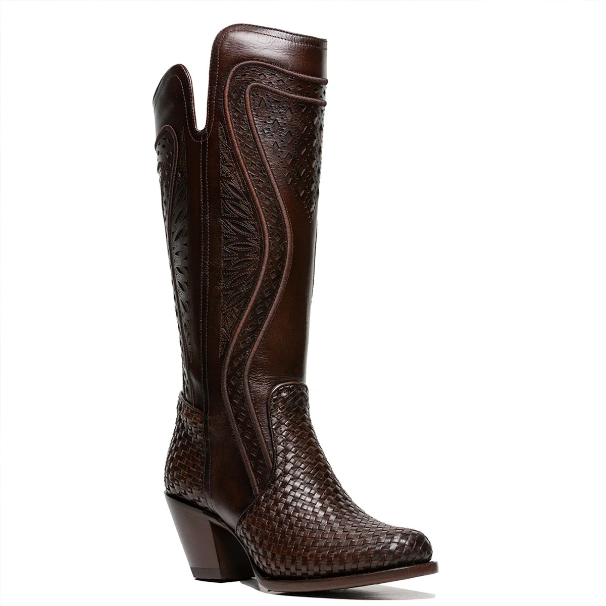 These women's cowboy boots are a masterpiece of handmade elegance and artistry. Their entire design is rich with textures, featuring a beautiful blend of embroidery, perforated patterns, detailed stitching, and interwoven leather.