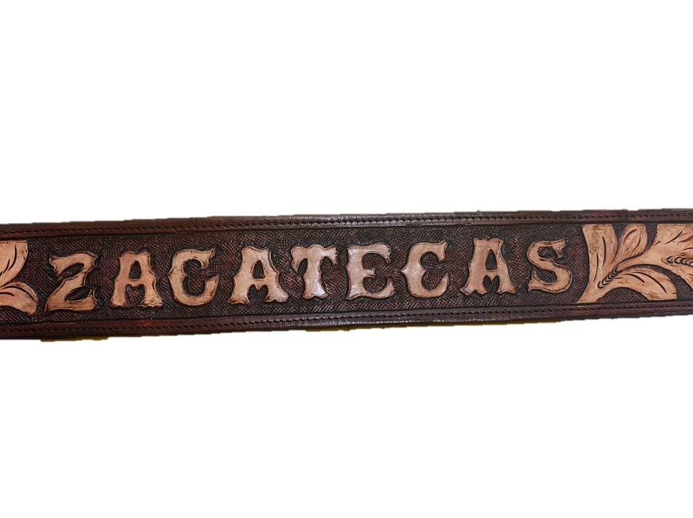 Hand-Tooled western belts with Mexican states names engraved on them. Available in Sinaloa, Zacatecas, Michoacán and Jalisco.