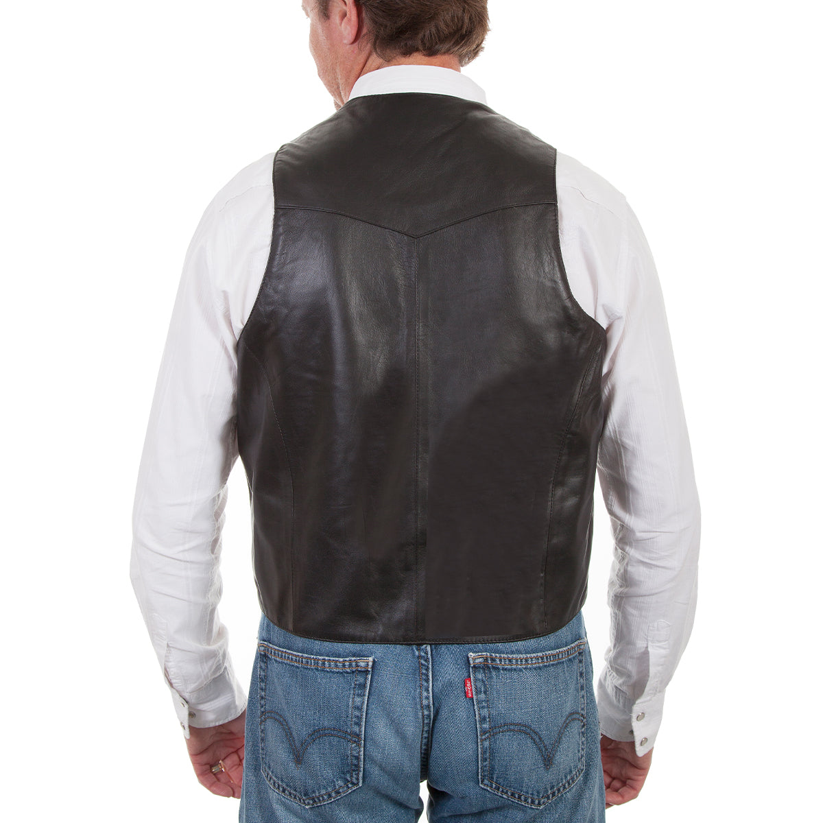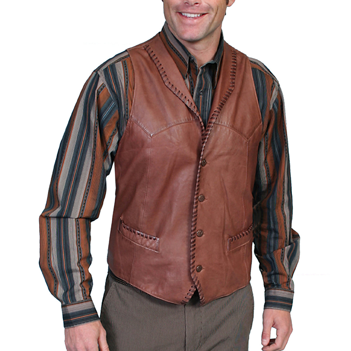 This distinctive all leather vest features a whip stitch trim throughout. It has single point front and back yokes, a four button front closure, and two welt pockets with whip stitch trim.