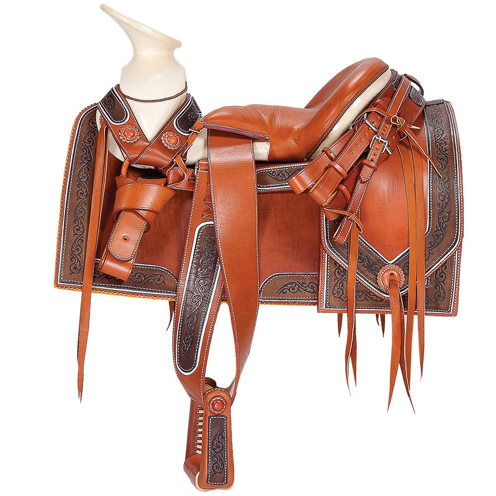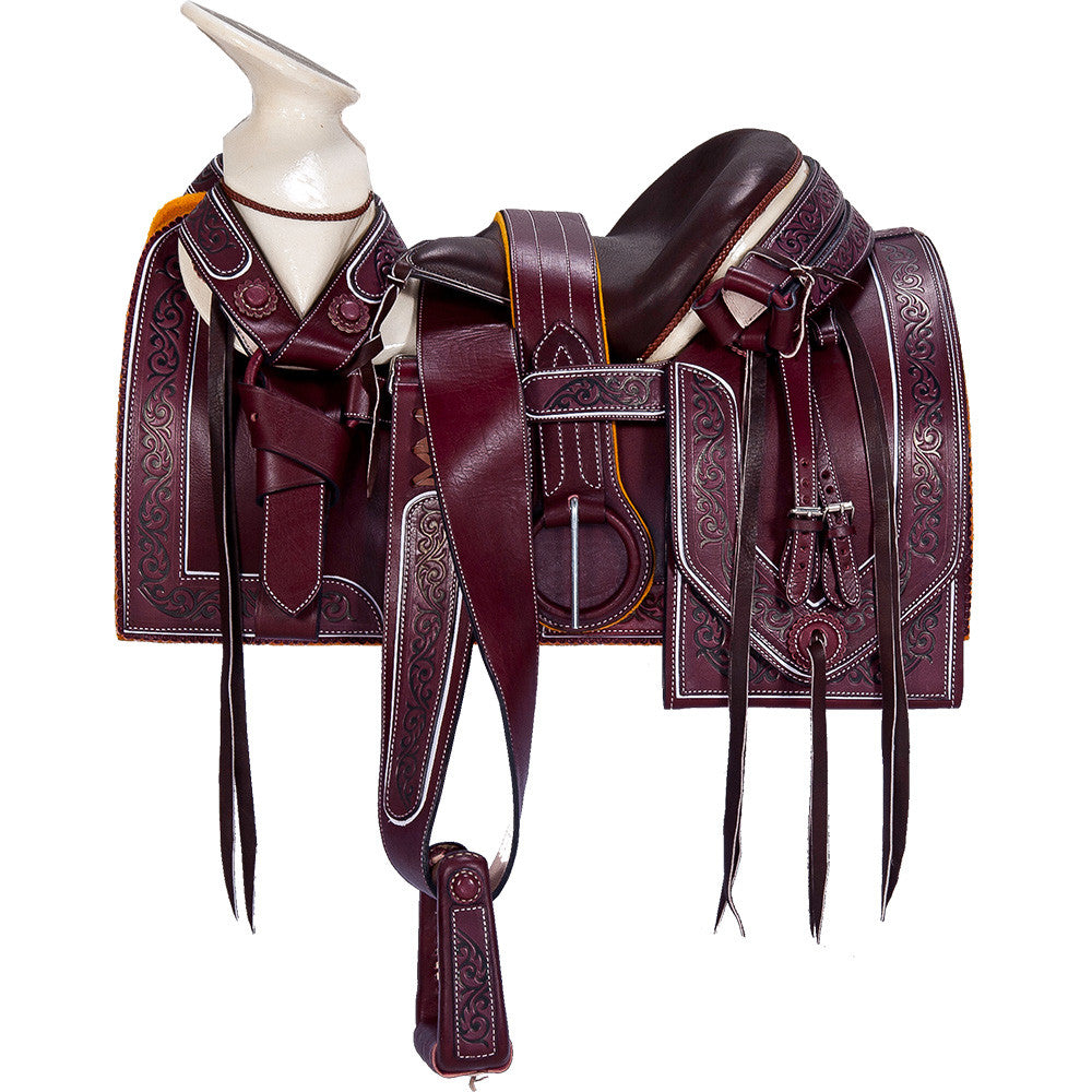 Silla de montar tradicional hecha por artesanos Mexicanos con diseños bordados en cuero en un patrón decorativo.