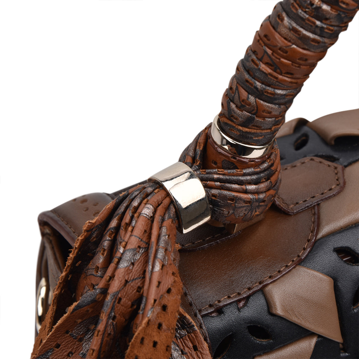 Carry your things in style with this sophisticated brown leather satchel handbag! Crafted from genuine leather with delightful floral designs, plus a leather bandana for a touch of professionalism, it's a timeless look you can take any where.