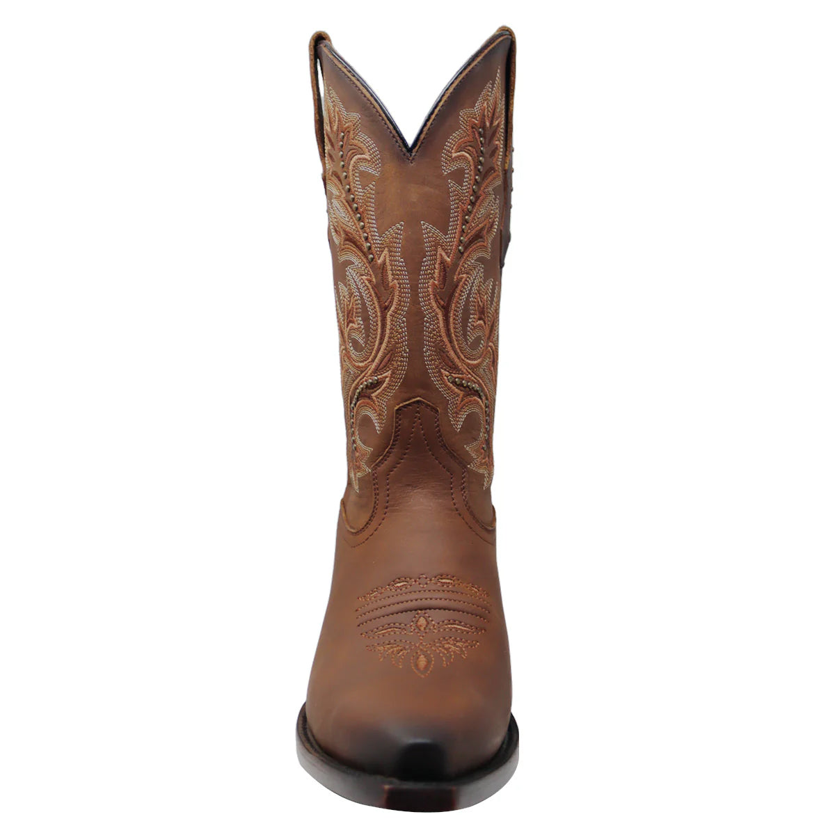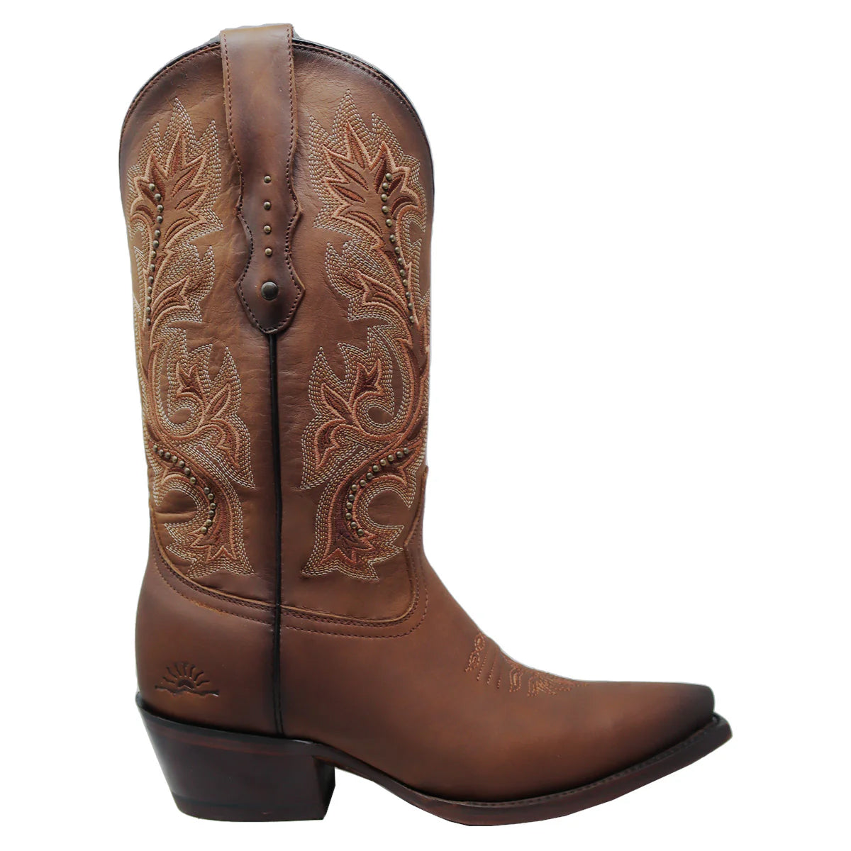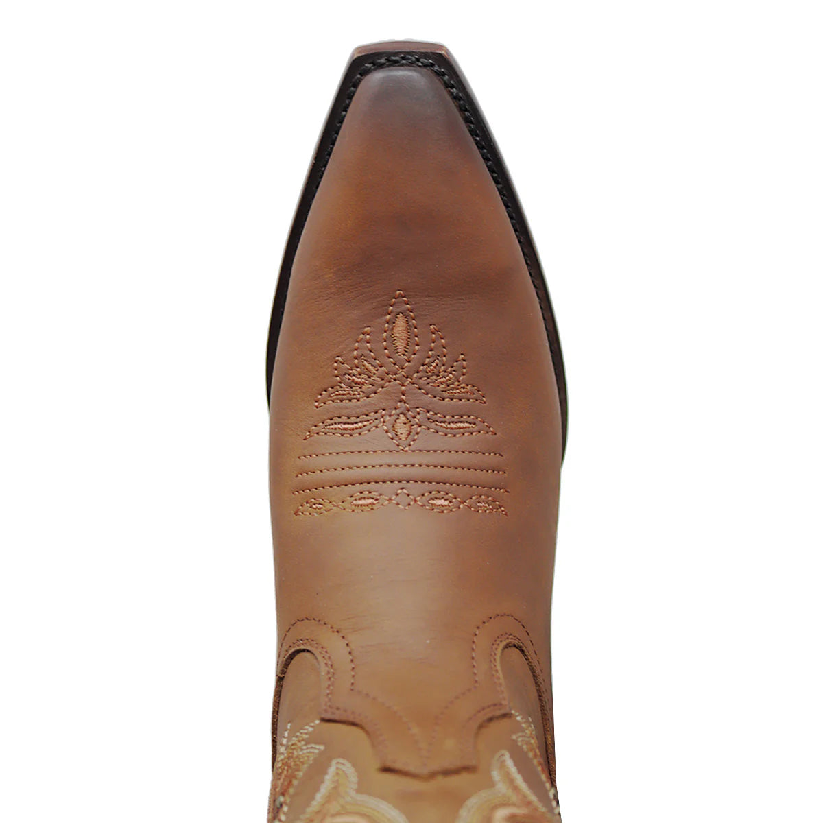 These Western-inspired boots feature eye-catching thread topstitching in various colors and a unique design. Get ready to make a statement in your next pair of western boots.